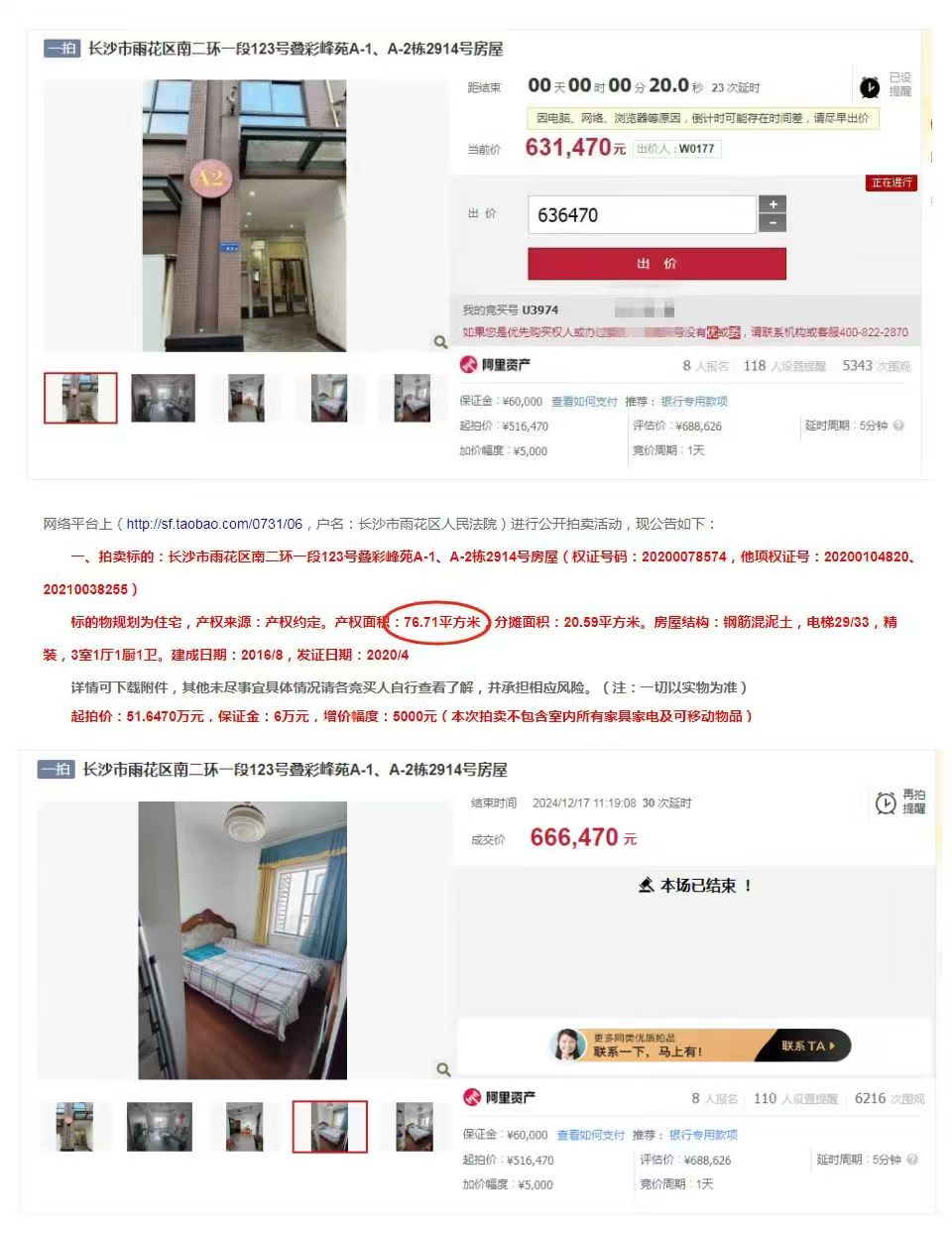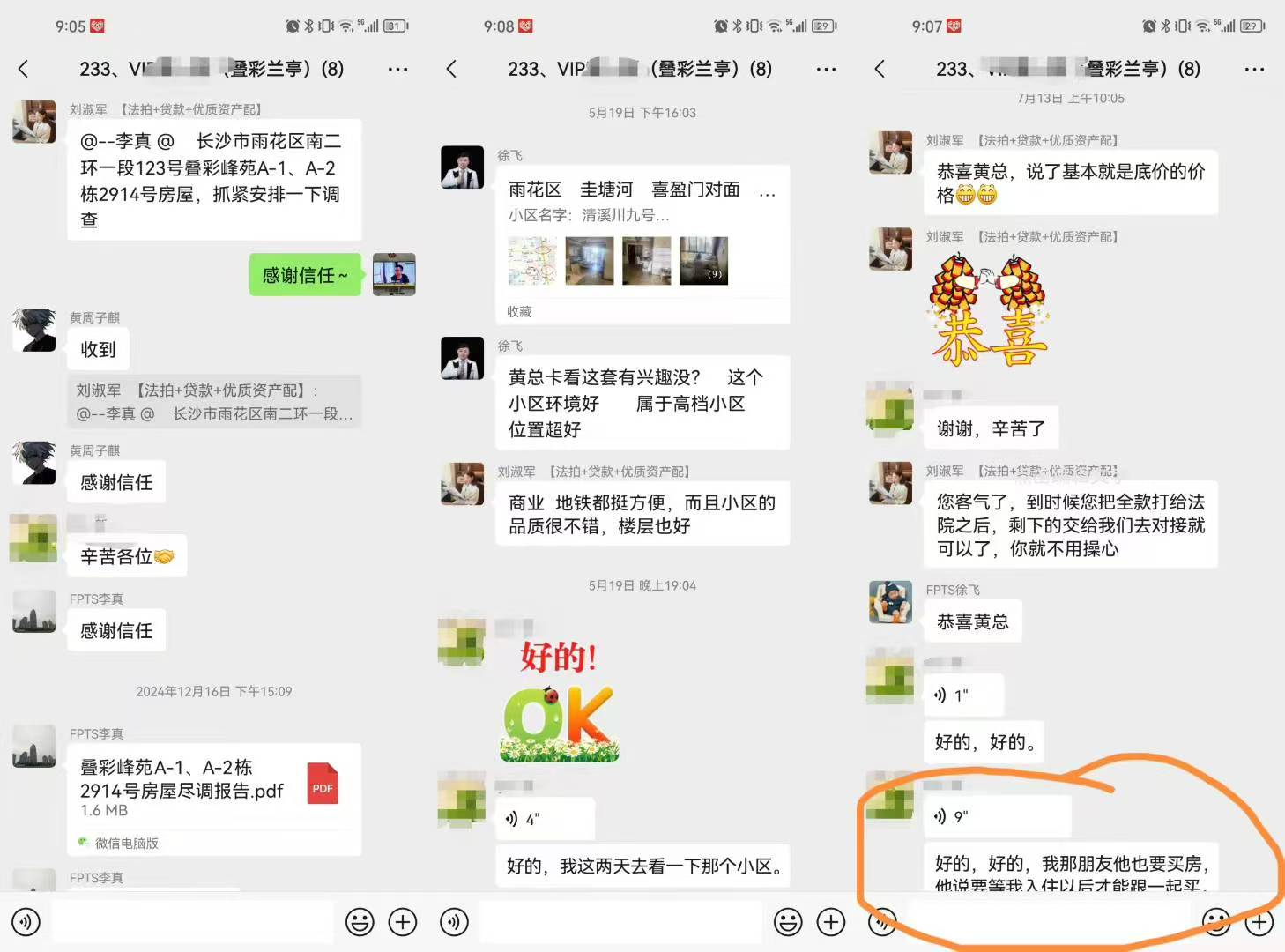 (圖7)黃總是我公司(湖南法拍網(wǎng)法拍房地產(chǎn)經(jīng)紀(jì)有限公司)第233個(gè)VIP客戶,去年12月簽約的,當(dāng)時(shí)就是沖著拍疊彩峰苑的2914來的(圖5),結(jié)果51萬起拍,8個(gè)人搶,拍到66萬去了,沒拍贏,然后就慢慢的又繼續(xù)看別的,看到現(xiàn)在終于又等到了這一套,還是29樓,2910,這次沒人競(jìng)爭(zhēng)了,直接57.5萬底價(jià)拿下,比上一套便宜近9萬塊錢,真香,哈哈哈。